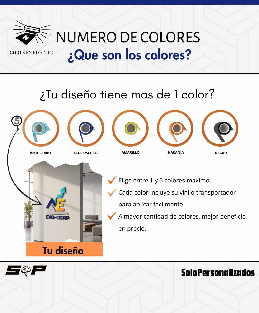 Para el servicio de vinilo de corte solo debes seleccionar la cantidad de colores que necesites. Luego revisa las medidas de tu diseño y selecciona el tamaño que corresponda por pieza. Después indica dónde vas a instalar tu vinilo: si es en interior, como en cristales, selecciona la opción “modo espejo”, y si es en exterior, selecciona “fuera”. Finalmente, dirígete a la imagen Nº 5, elige el color que deseas y escribe la referencia en la casilla de texto. Con estos pasos el sistema calculará automáticamente el precio de tu pedido
